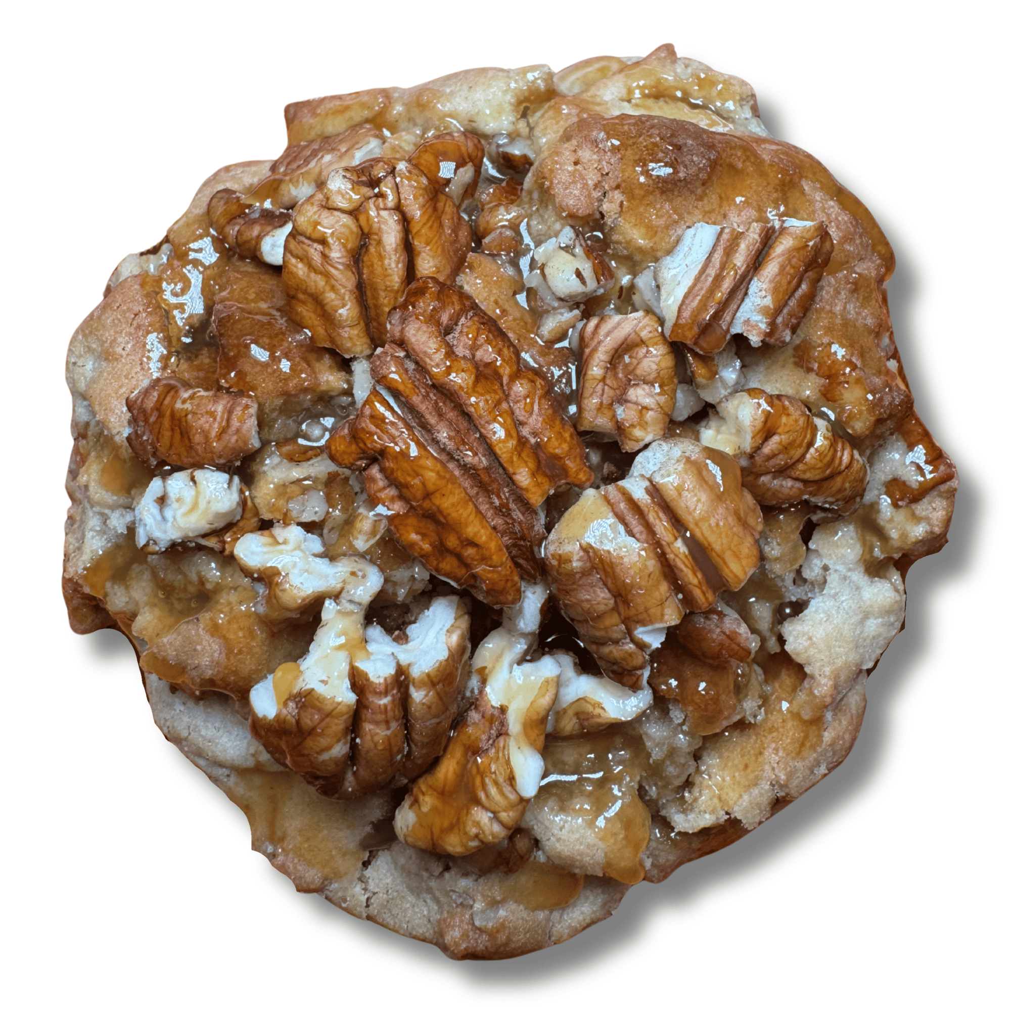A creamy, buttery base cookie dough packed with short bread cookie pieces and roasted pecans. Baked with a crunchy exterior and a soft center. Topped with a hint of salted caramel drizzle and chopped pecans!!